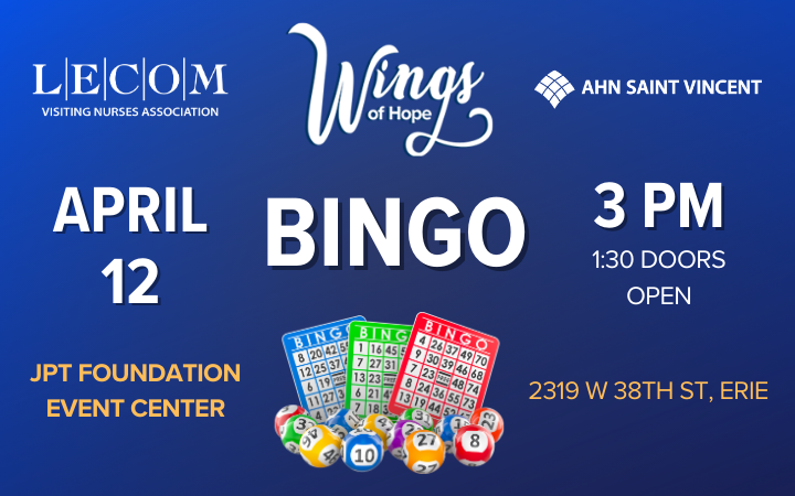 Save the date! Join us for Wings of Hope Bingo on Sunday, April 11, at the JPT Foundation Event Center. A $30 donation includes entry, plus 10 games of bingo. At the event, participate in basket raffles, special games, tip boards and more! All proceeds benefit the Wings of Hope Fund, supporting Visiting Nurses Association hospice patients and their families. Get your tickets before the event and be eligible to play an extra special game!